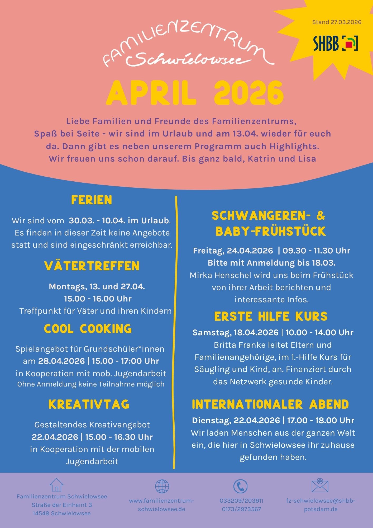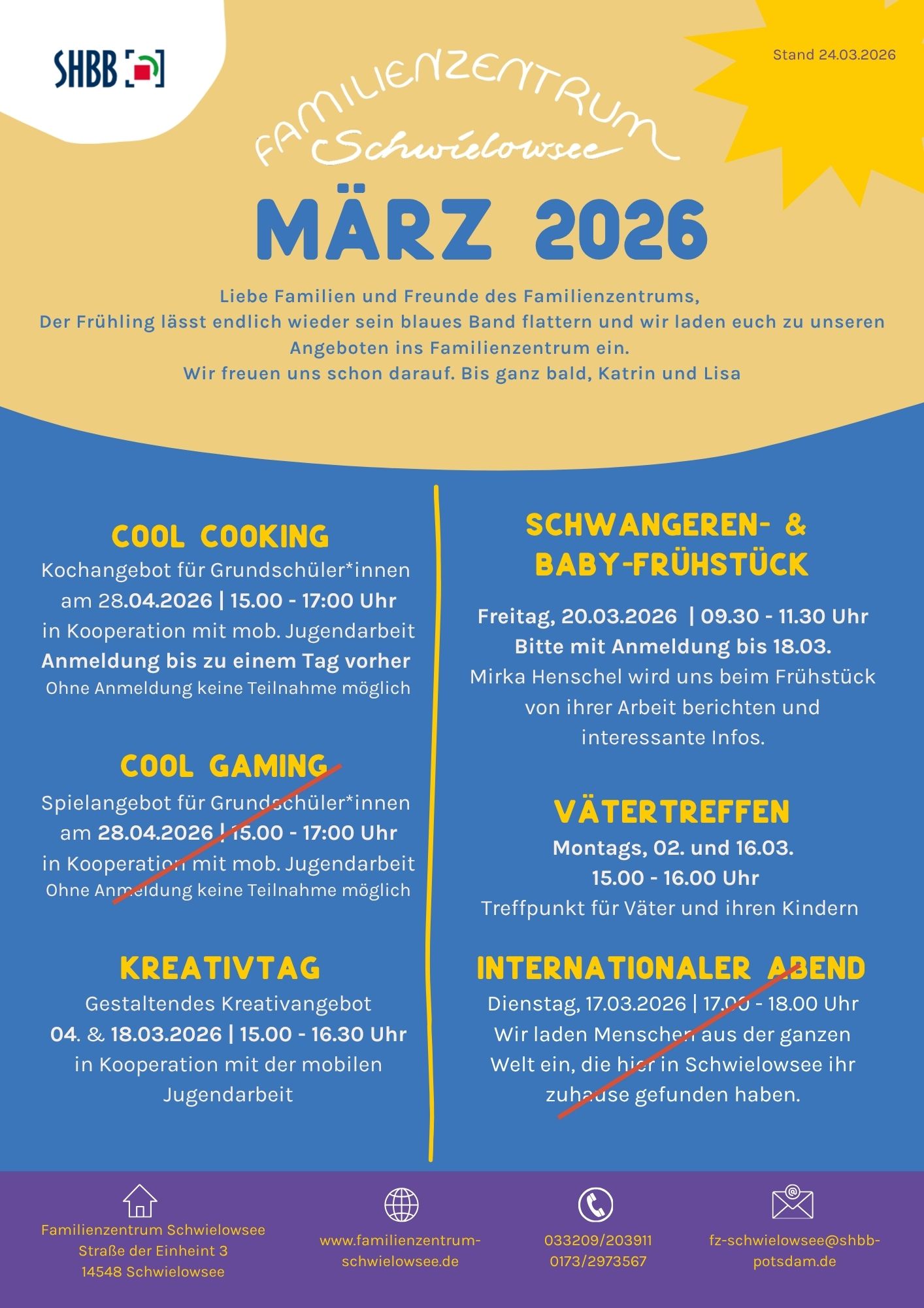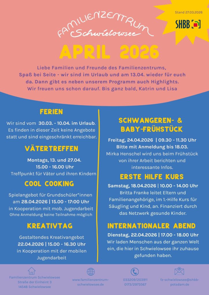 Regelmäßige Treffpunkte sind die Baby- & Krabbelgruppen oder das Familiencafé/ Spielenachmittag für Familien. Auch Angebote für die Senioren aus der Gemeinde Schwielowsee werden angeboten.
